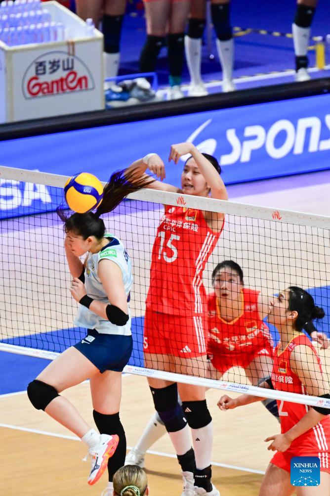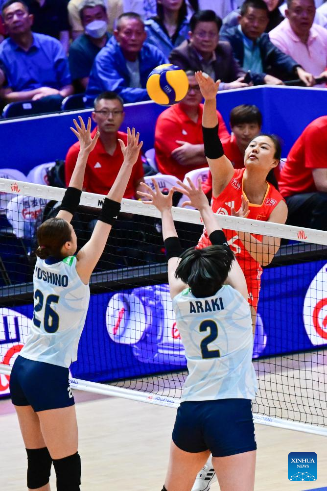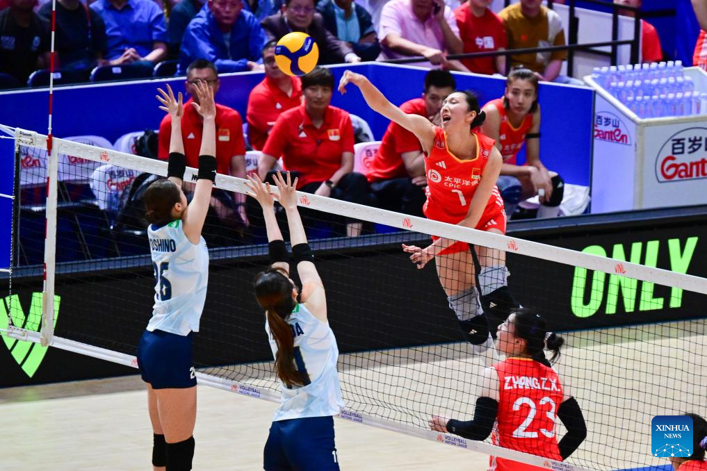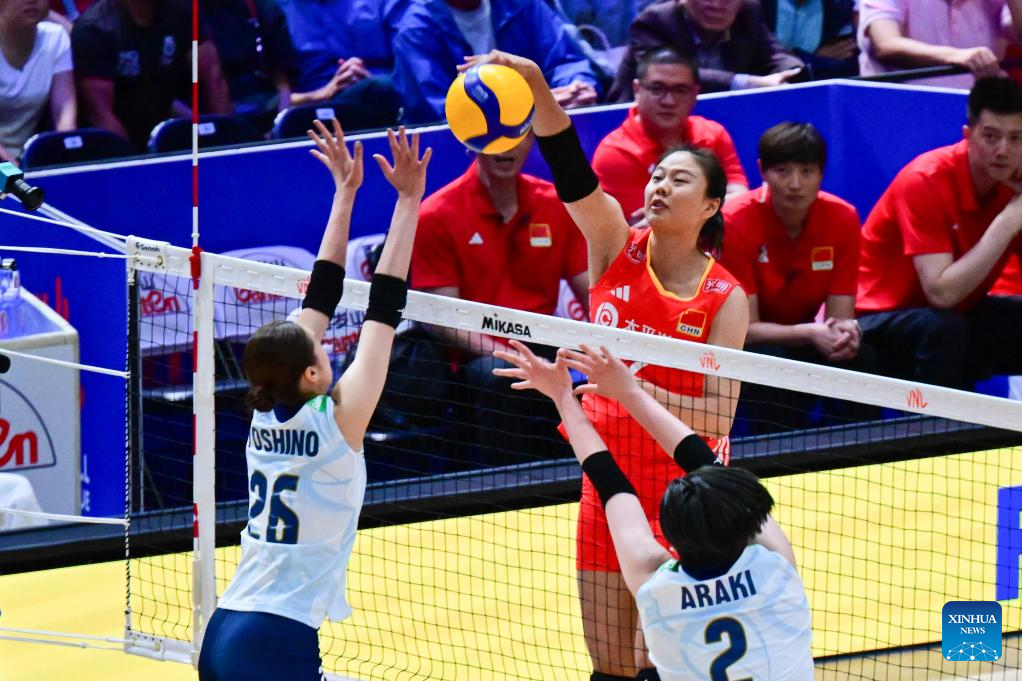 Wu Mengjie (top R) of China competes during the Pool 5 match between China and Japan at the Women's Volleyball Nations League (VNL) 2025 in Hong Kong, south China, June 21, 2025. (Xinhua/Zhu Wei)
