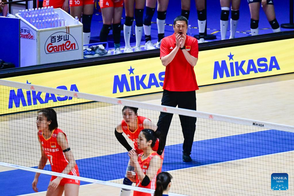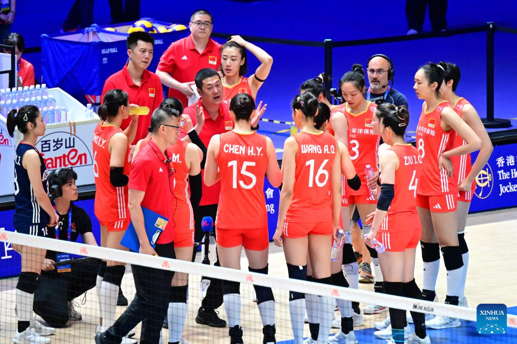 Zhao Yong (C), head coach of China gives instructions during the Pool 5 match between China and Japan at the Women's Volleyball Nations League (VNL) 2025 in Hong Kong, south China, June 21, 2025. (Xinhua/Zhu Wei)