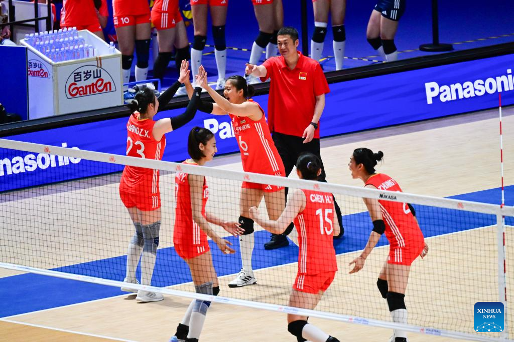 Players Gong Xiangyu (C), Wang Yuanyuan (L) and head coach Zhao Yong of China celebrate during the Pool 5 match between China and Japan at the Women's Volleyball Nations League (VNL) 2025 in Hong Kong, south China, June 21, 2025. (Xinhua/Zhu Wei)