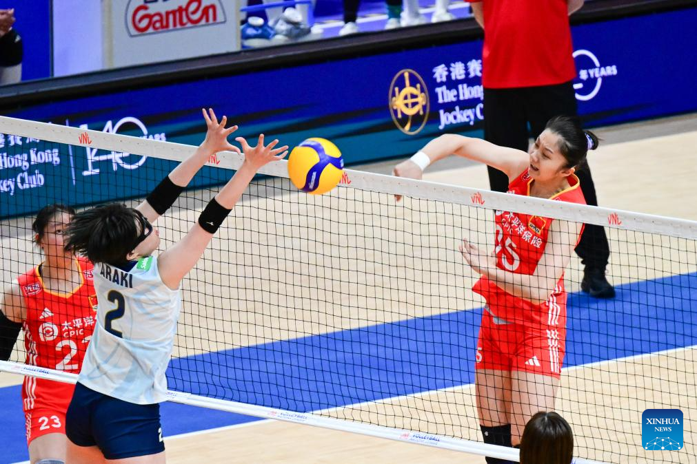 Gong Xiangyu (R) of China competes during the Pool 5 match between China and Japan at the Women's Volleyball Nations League (VNL) 2025 in Hong Kong, south China, June 21, 2025. (Xinhua/Zhu Wei)