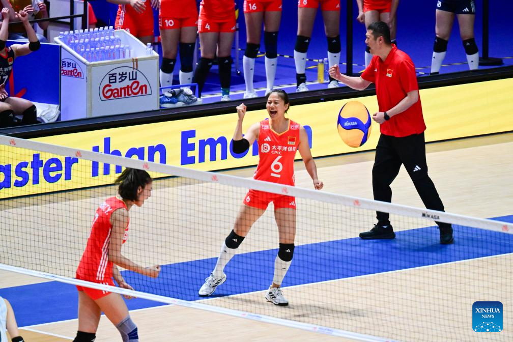 Players of China celebrate during the Pool 5 match between China and Japan at the Women's Volleyball Nations League (VNL) 2025 in Hong Kong, south China, June 21, 2025. (Xinhua/Zhu Wei)
