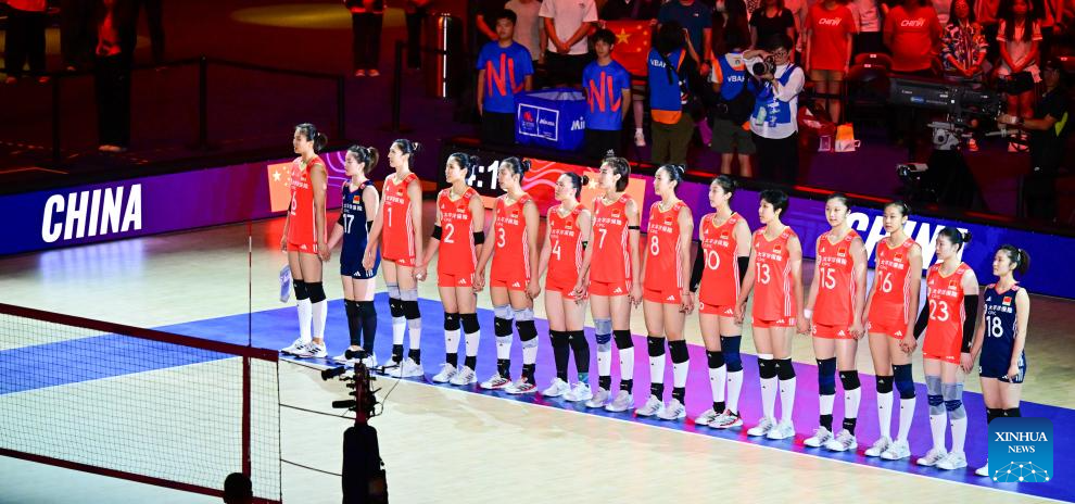 Players of China stand in line for the national anthem before the Pool 5 match between China and Japan at the Women's Volleyball Nations League (VNL) 2025 in Hong Kong, south China, June 21, 2025. (Xinhua/Zhu Wei)