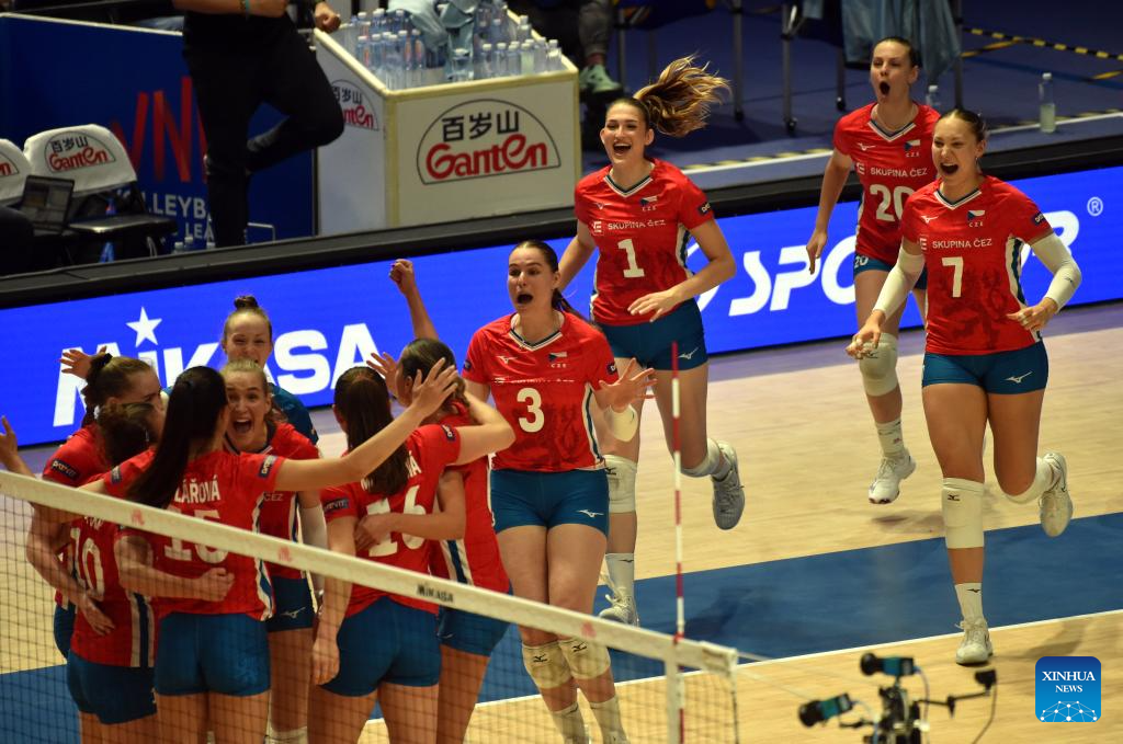 Players of the Czech Republic celebrate after the Pool 5 match between Thailand and the Czech Republic at the Women's Volleyball Nations League (VNL) 2025 in Hong Kong, south China, June 21, 2025. (Xinhua/Lo Ping Fai)