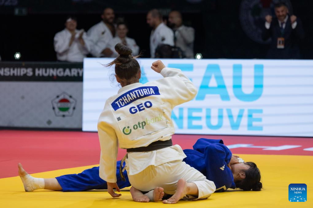 Mariam Tchanturia (front) of Georgia reacts after defeating Lee Yerang of South Korea during the mixed teams final between Georgia and South Korea at the IJF Judo World Championships 2025 in Budapest, Hungary on June 20, 2025. (Photo by Attila Volgyi/Xinhua)