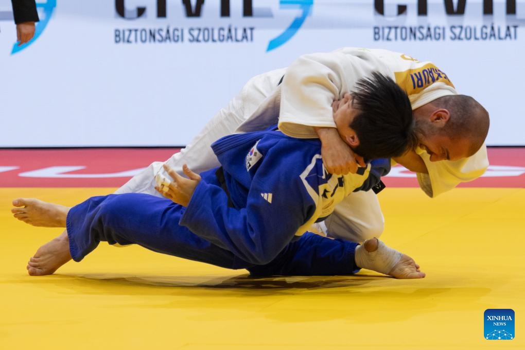 Lasha Bekauri (back) of Georgia and Kim Jonghoon of South Korea compete during the mixed teams final between Georgia and South Korea at the IJF Judo World Championships 2025 in Budapest, Hungary on June 20, 2025. (Photo by Attila Volgyi/Xinhua)