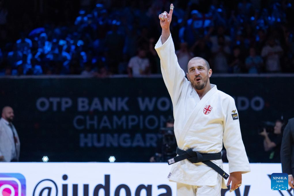 Lasha Bekauri of Georgia reacts after defeating Kim Jonghoon of South Korea during the mixed teams final between Georgia and South Korea at the IJF Judo World Championships 2025 in Budapest, Hungary on June 20, 2025. (Photo by Attila Volgyi/Xinhua)