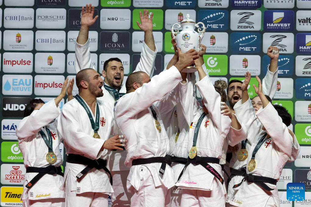 Members of the gold medalist team Georgia pose during the awarding ceremony after the mixed teams final between Georgia and South Korea at the IJF Judo World Championships 2025 in Budapest, Hungary on June 20, 2025. (Photo by Attila Volgyi/Xinhua)
