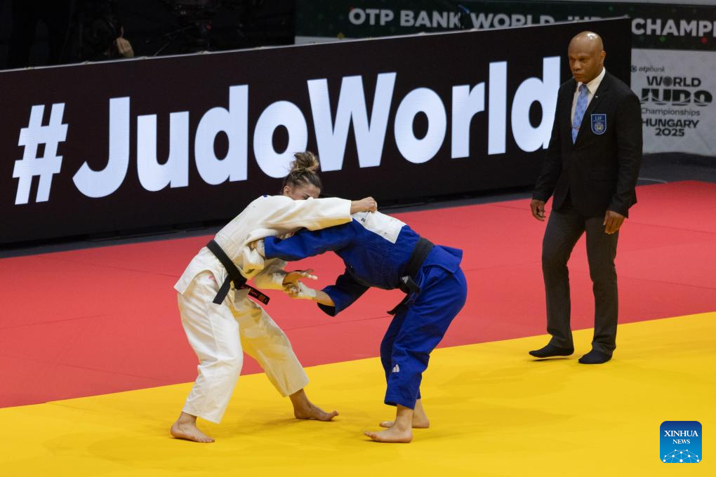 Mariam Tchanturia (L) of Georgia and Lee Yerang of South Korea compete during the mixed teams final between Georgia and South Korea at the IJF Judo World Championships 2025 in Budapest, Hungary on June 20, 2025. (Photo by Attila Volgyi/Xinhua)