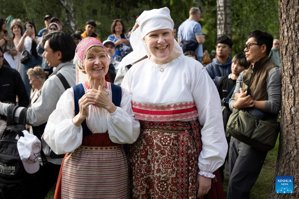 People dressed in traditional Finnish costumes pose for photos during the Midsummer Eve celebration on Seurasaari Island in Helsinki, Finland, June 20, 2025. Thousands gathered on Helsinki's Seurasaari Island Friday evening to celebrate Juhannus Eve, marking the start of Finland's cherished Midsummer Festival with bonfires and folk traditions. (Photo by Matti Matikainen/Xinhua)