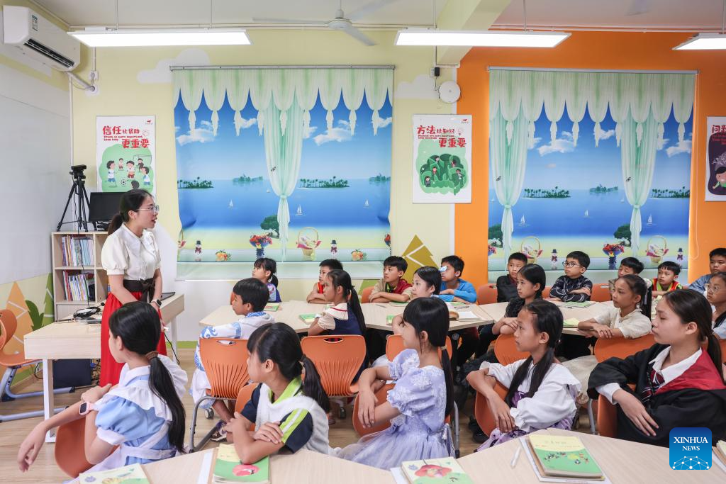 Students has a fairy tail reading class in the Experimental Primary School in Hanlin Town of Ding'an County, south China's Hainan Province, June 20, 2025. Teachers in the school organized role-playing activities and interactive discussions to generate students' enthusiasm for reading. (Xinhua/Zhang Liyun)
