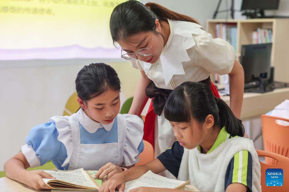 Students perform a finger dance before a class in the Experimental Primary School in Hanlin Town of Ding'an County, south China's Hainan Province, June 20, 2025. Teachers in the school organized role-playing activities and interactive discussions to generate students' enthusiasm for reading. (Xinhua/Zhang Liyun)
