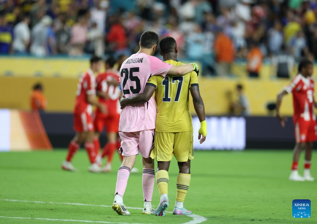 Agustin Marchesin (L), goalkeeper of CA Boca Juniors, and CA Boca Juniors' Luis Advincula react during the group C match between Bayern Munich of Germany and CA Boca Juniors of Argentina at the FIFA Club World Cup 2025 at the Hard Rock Stadium, Miami, the United States, June 20, 2025. (Xinhua/Li Ming)