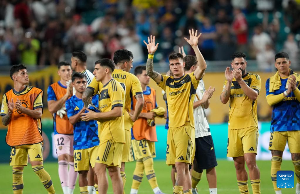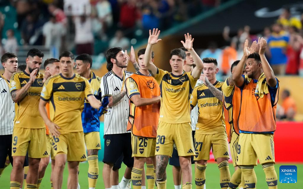 Players of CA Boca Juniors greet spectators after the group C match between Bayern Munich of Germany and CA Boca Juniors of Argentina at the FIFA Club World Cup 2025 at the Hard Rock Stadium, Miami, the United States, June 20, 2025. (Xinhua/Huang Zongzhi)