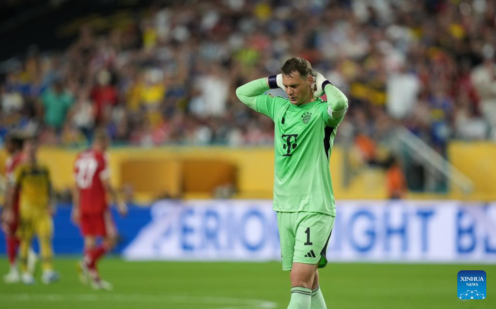 Manuel Neuer, goalkeeper of Bayern Munich, reacts during the group C match between Bayern Munich of Germany and CA Boca Juniors of Argentina at the FIFA Club World Cup 2025 at the Hard Rock Stadium, Miami, the United States, June 20, 2025. (Xinhua/Huang Zongzhi)