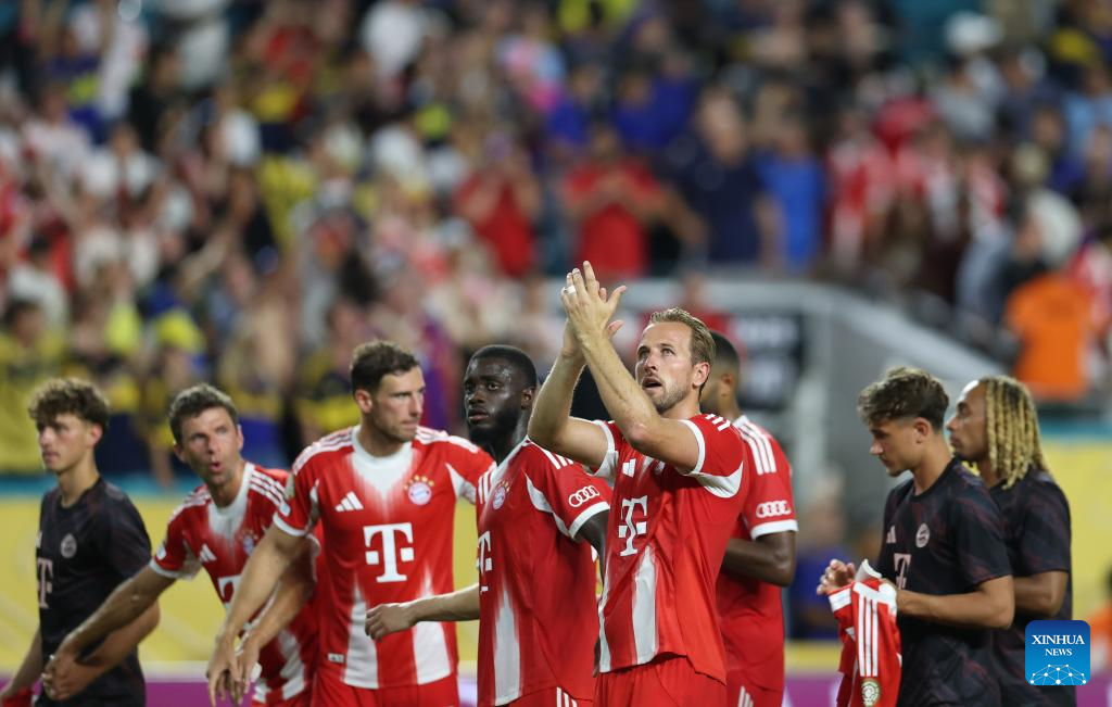 Bayern Munich's Harry Kane (Front) and his teammates greet the spectators after the group C match between Bayern Munich of Germany and CA Boca Juniors of Argentina at the FIFA Club World Cup 2025 at the Hard Rock Stadium, Miami, the United States, June 20, 2025. (Xinhua/Li Ming)