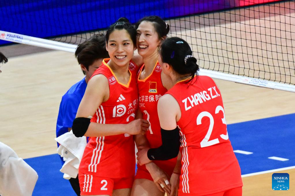 Zhuang Yushan (2nd L), Wu Mengjie (2nd R) and Zhang Zixuan (1st R) of China celebrate during the Pool 5 match between China and Japan at the Women's Volleyball Nations League (VNL) 2025 in Hong Kong, south China, June 21, 2025. (Xinhua/Zhu Wei)