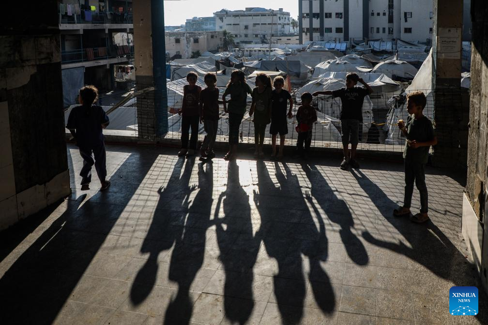 Displaced Palestinian children are seen inside a school-turned shelter in Gaza City, June 20, 2025. (Photo by Rizek Abdeljawad/Xinhua)