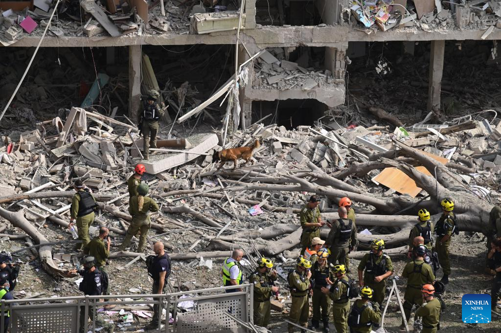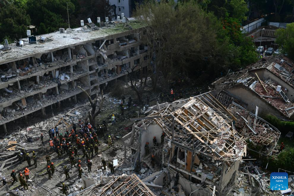 Israeli security and rescue forces work at the site of an Iranian missile attack in Tel Aviv, central Israel, on June 22, 2025. Ballistic missiles fired from Iran into central and northern Israel on Sunday morning wounded 26 people, two of whom in moderate condition, Israel's national emergency service Magen David Adom reported. Iran's Islamic Revolution Guards Corps on Sunday confirmed the attack, saying that the fresh wave of attacks targeted Ben Gurion Airport in Tel Aviv and a biological research center, among others.(Tomer Neuberg/JINI via Xinhua)