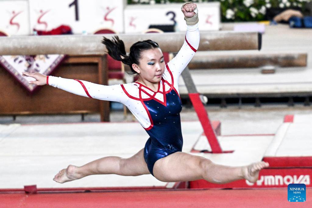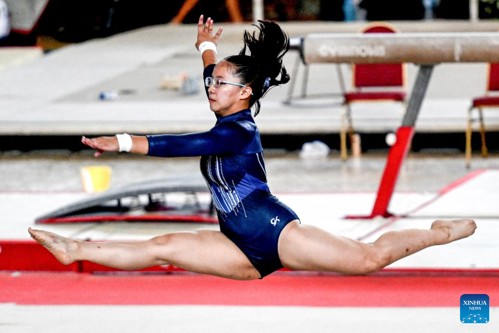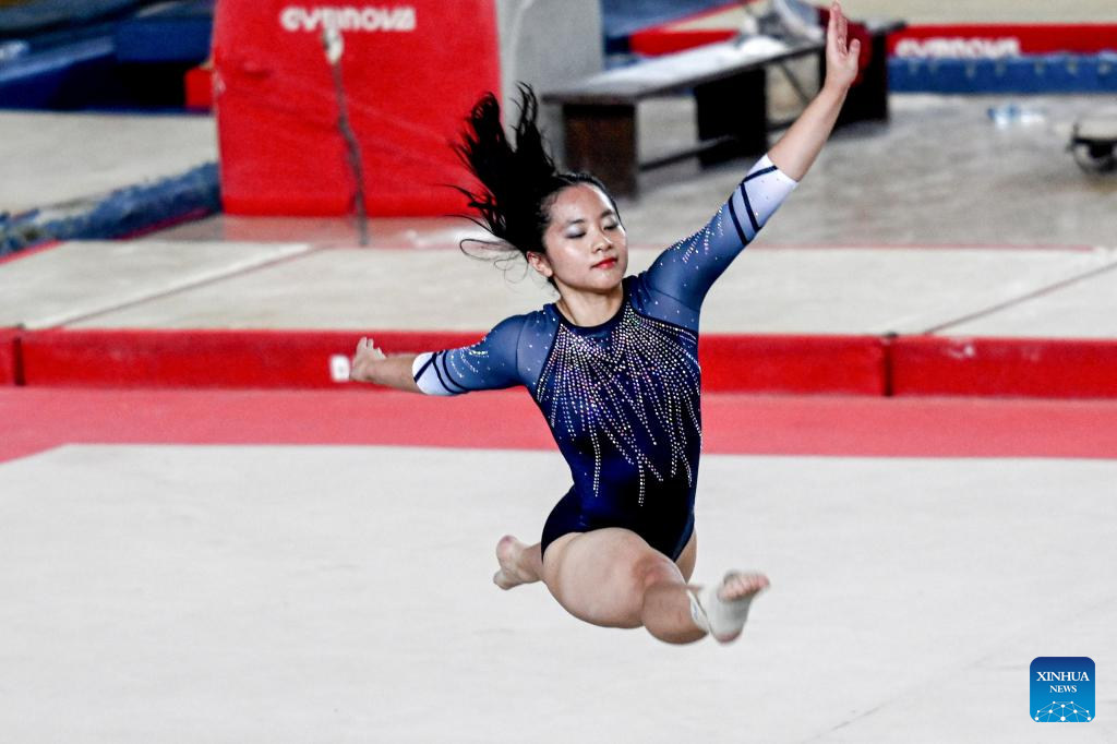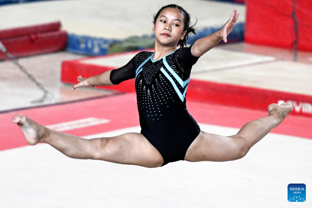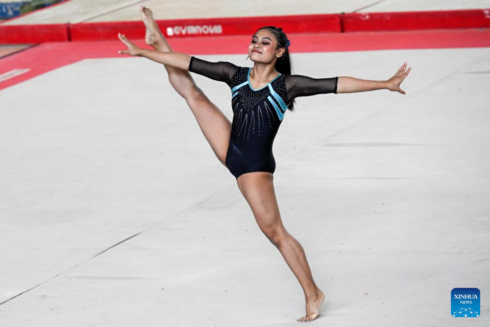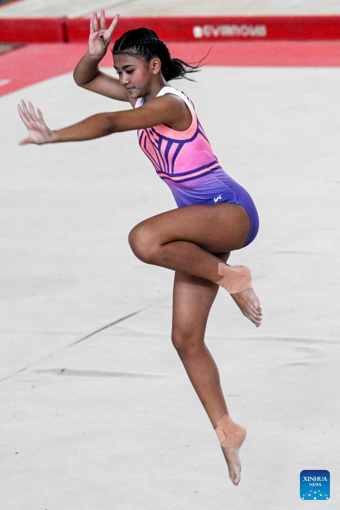 Nur Nala Sadhu from Gavrila Gymnastics Jakarta competes during the final match of artistic gymnastics girl's senior floor exercise at the Gymnastic Jakarta Open 2025 in Jakarta, Indonesia, June 22, 2025. (Xinhua/Agung Kuncahya B.)
