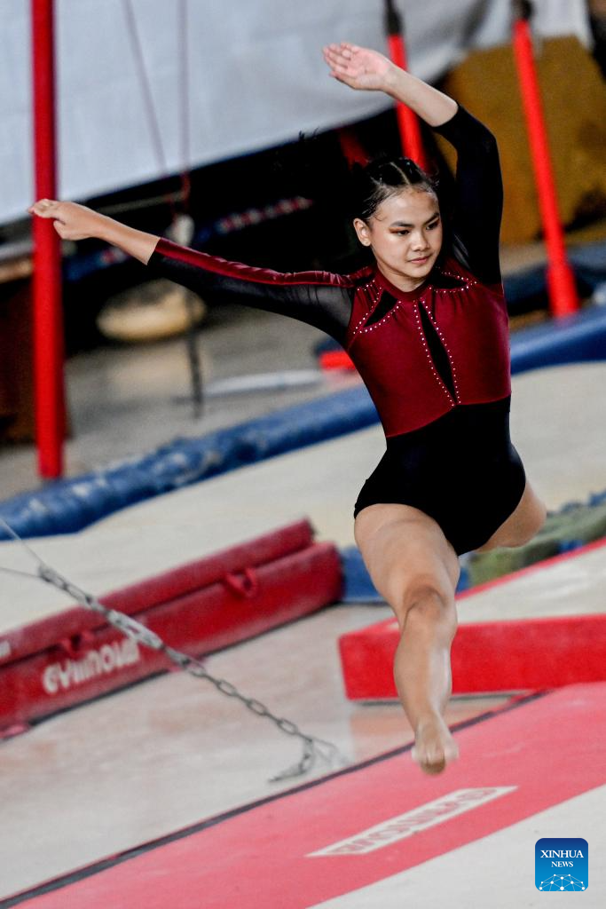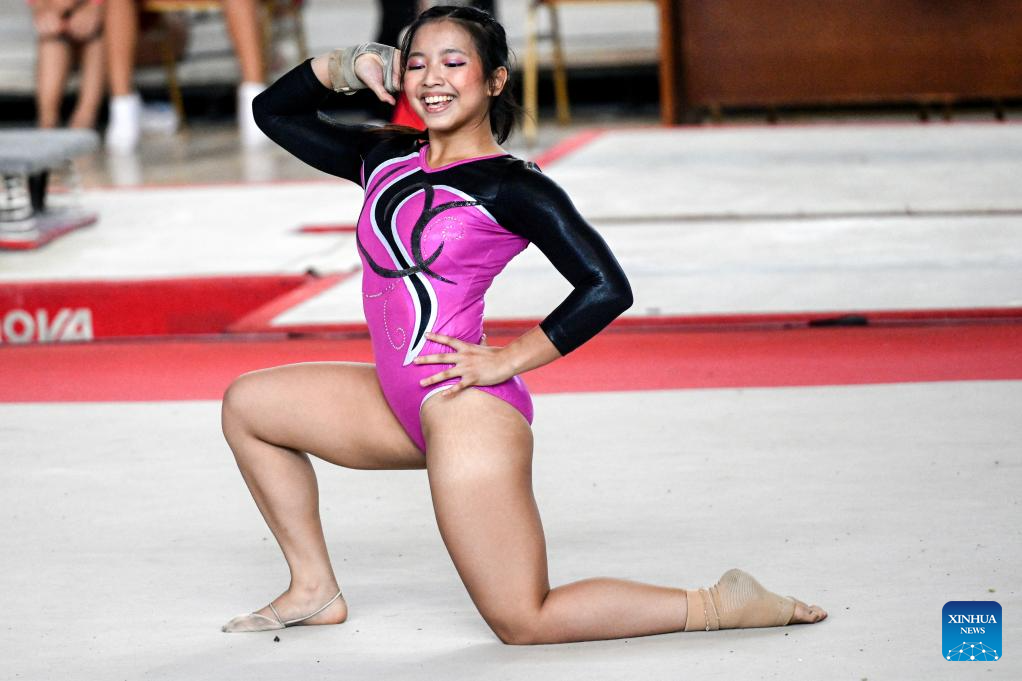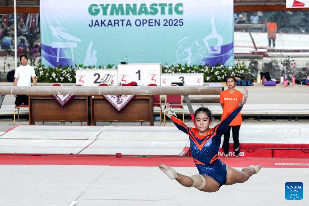 Jennifer Jassonita Toembelaka from Infinity Gymnastics Club competes during the final match of artistic gymnastics girl's junior floor exercise at the Gymnastic Jakarta Open 2025 in Jakarta, Indonesia, June 22, 2025. (Xinhua/Agung Kuncahya B.)