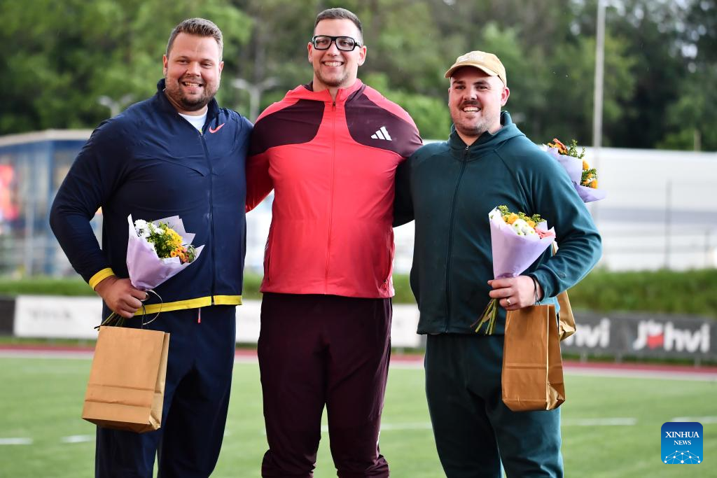 (From L to R) second-placed Daniel Stahl of Sweden, first-placed Kristjan Ceh of Slovenia, third-placed Matt Denny of Australia pose during the awarding ceremony of men's discus throw final at the World Athletics Continental Tour 2025 Heino Lipp memorial in Johvi, Estonia, June 21, 2025. (Photo by Sergei Stepanov/Xinhua)