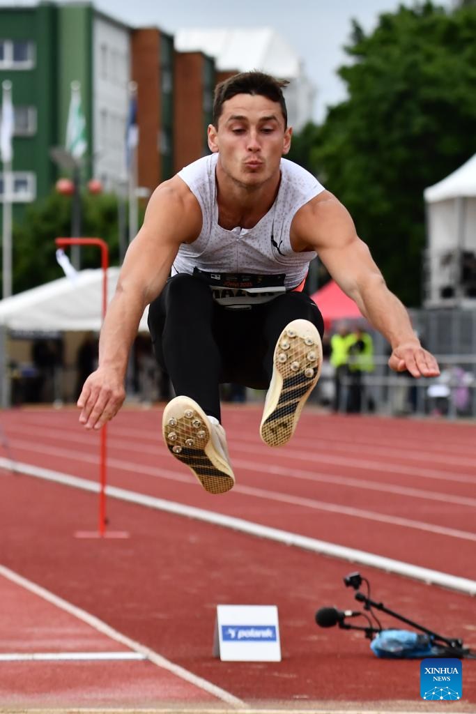 Vladyslav Mazur of Ukraine competes during the men's long jump event at the World Athletics Continental Tour 2025 Heino Lipp memorial in Johvi, Estonia, June 21, 2025. (Photo by Sergei Stepanov/Xinhua)