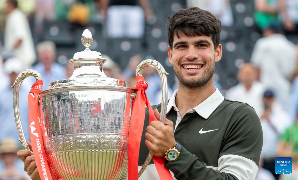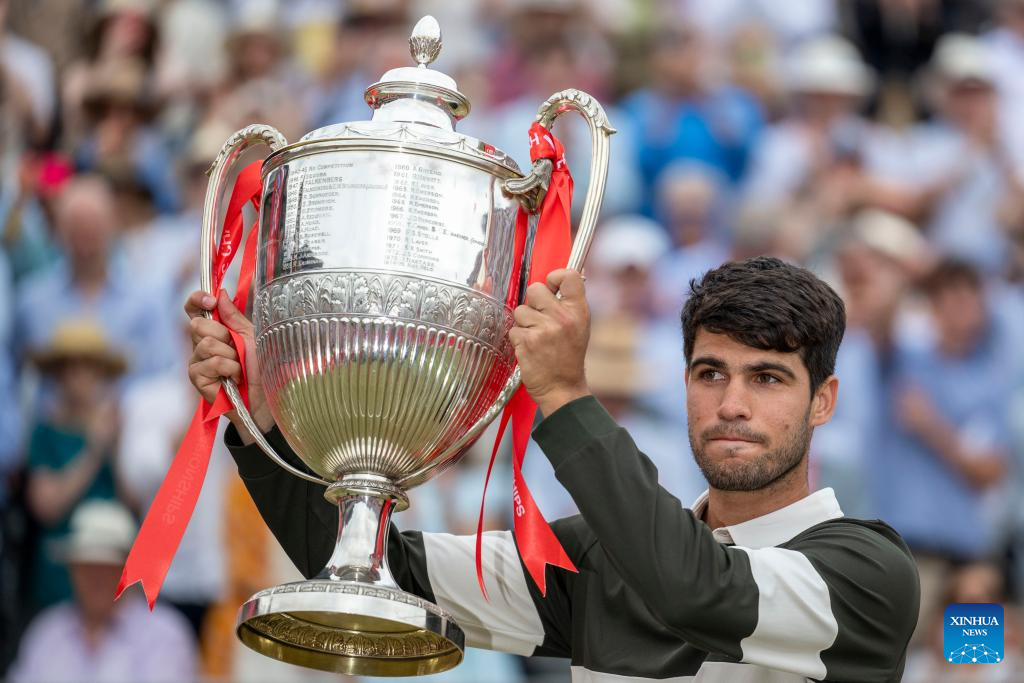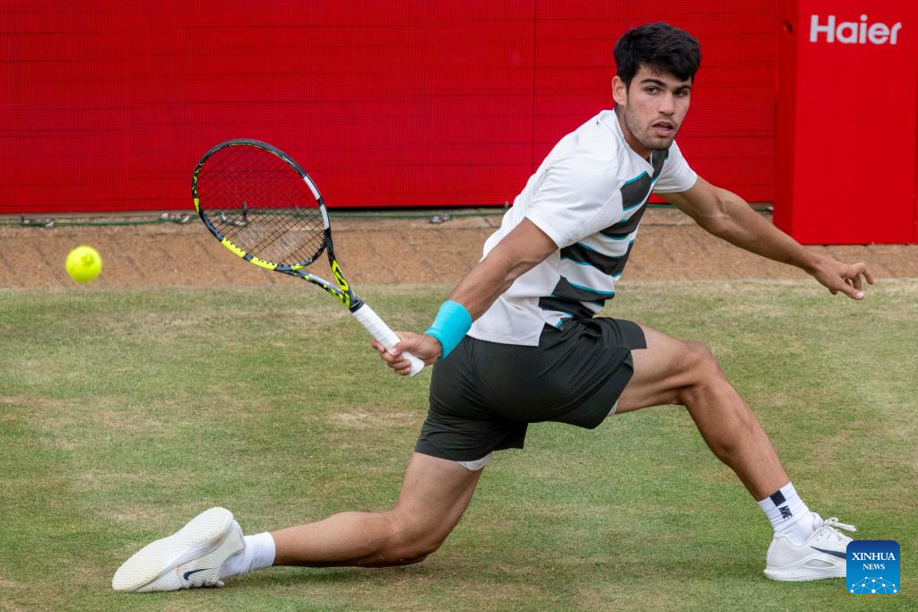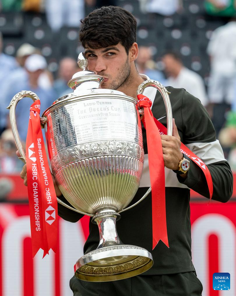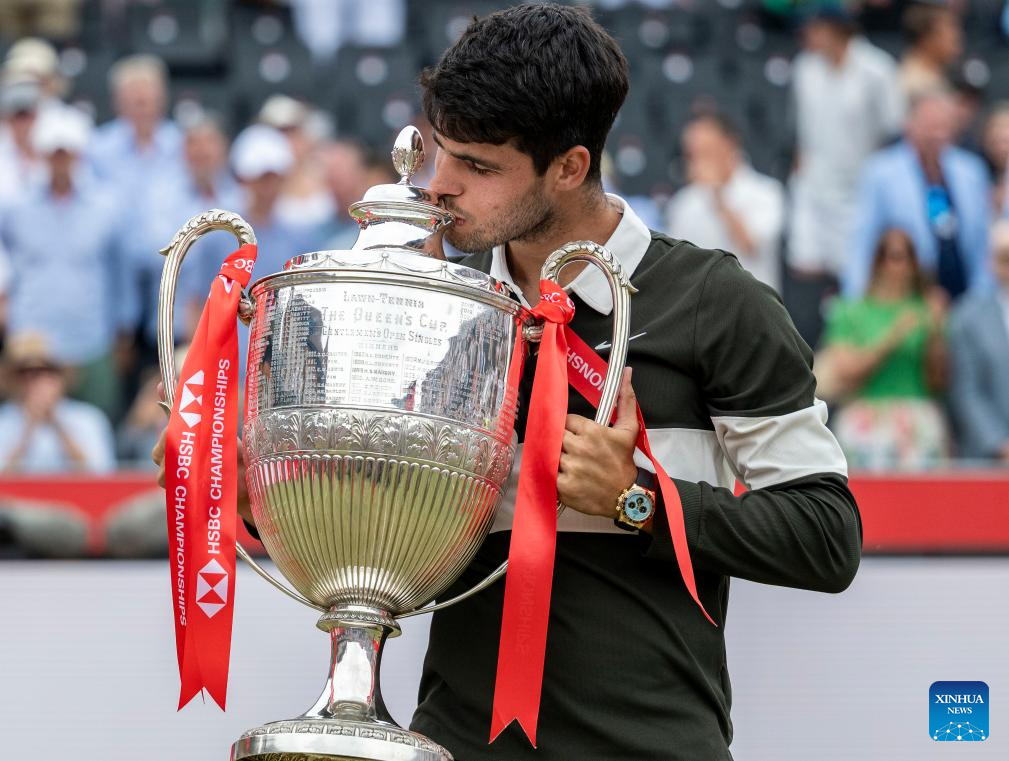 LONDON, June 22 (Xinhua) -- Top seed Carlos Alcaraz defeated Czech hopeful Jiri Lehecka 7-5, 6-7(5), 6-2 to claim the title at the Queen's Club Championships on Sunday.