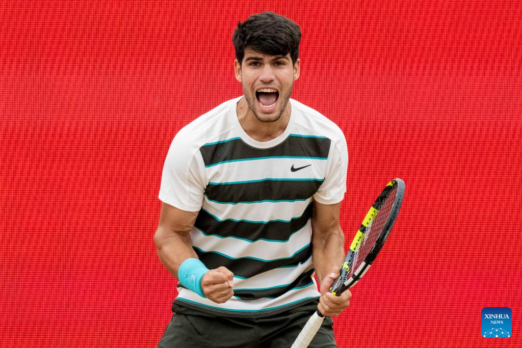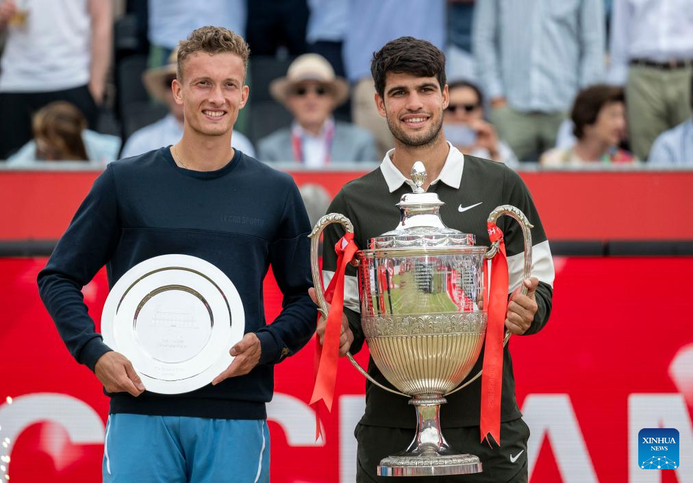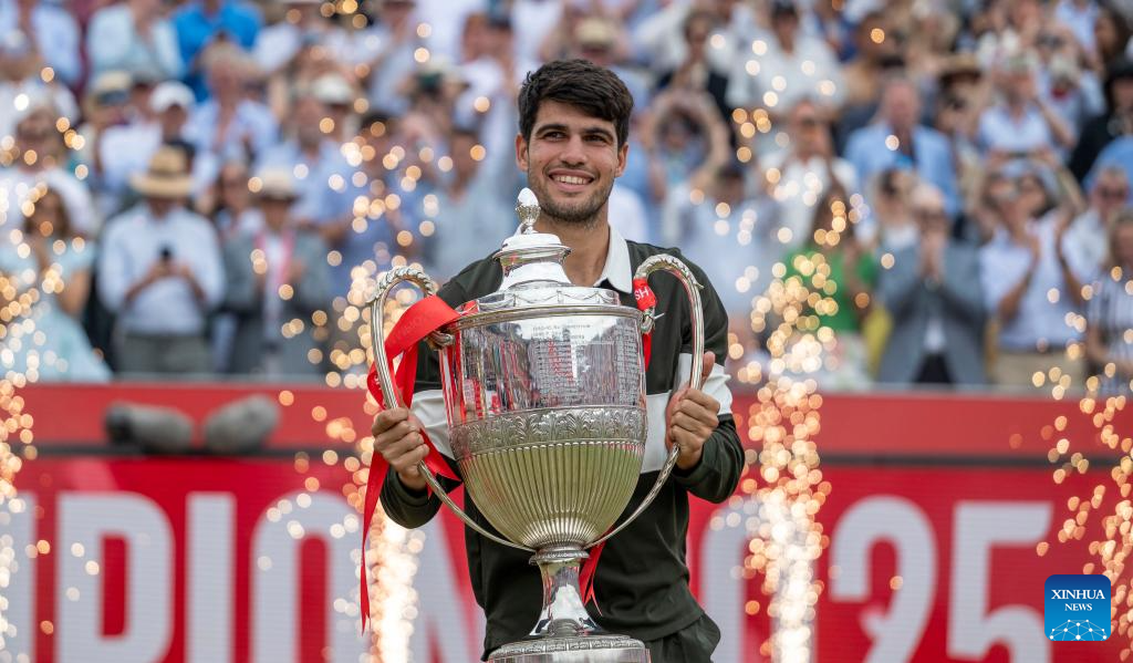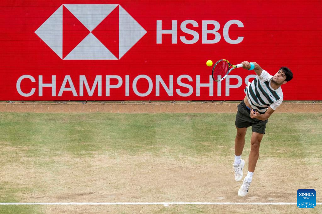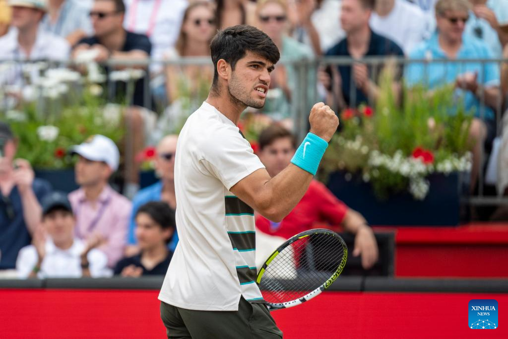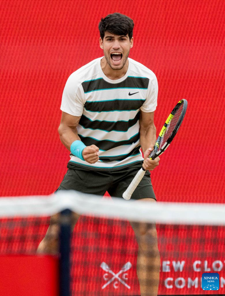 LONDON, June 22 (Xinhua) -- Top seed Carlos Alcaraz defeated Czech hopeful Jiri Lehecka 7-5, 6-7(5), 6-2 to claim the title at the Queen's Club Championships on Sunday.