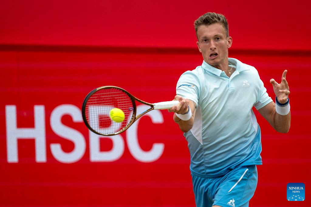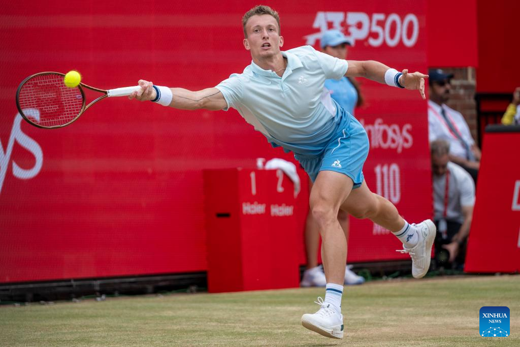 Jiri Lehecka returns a shot during the men's singles final between Carlos Alcaraz of Spain and Jiri Lehecka of the Czech Republic at the Queen's Club Championships in London, Britain, on June 22, 2025. (Photo by Stephen Chung/Xinhua)