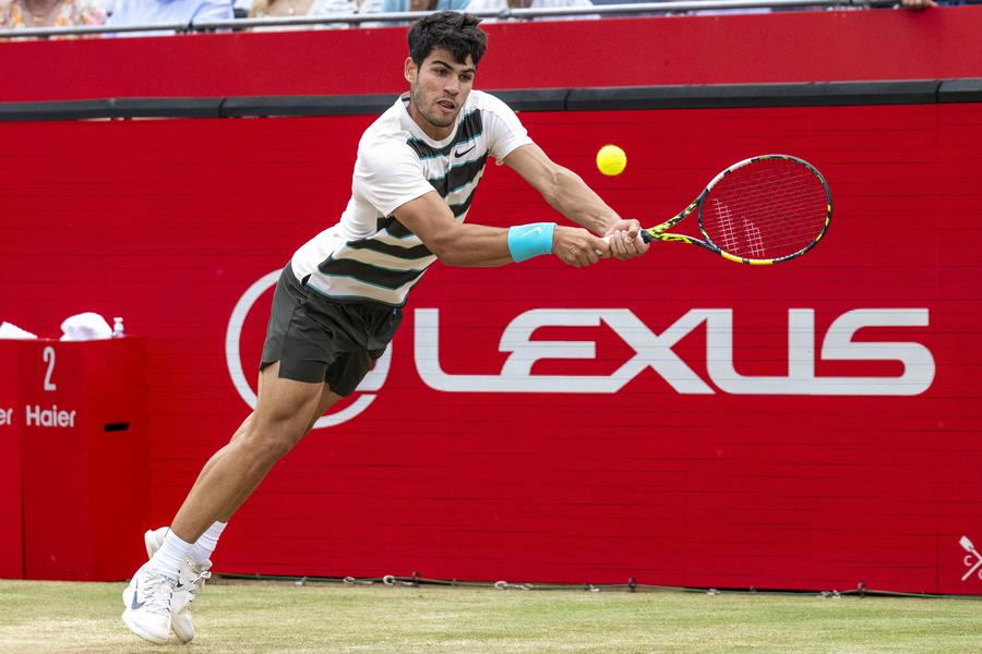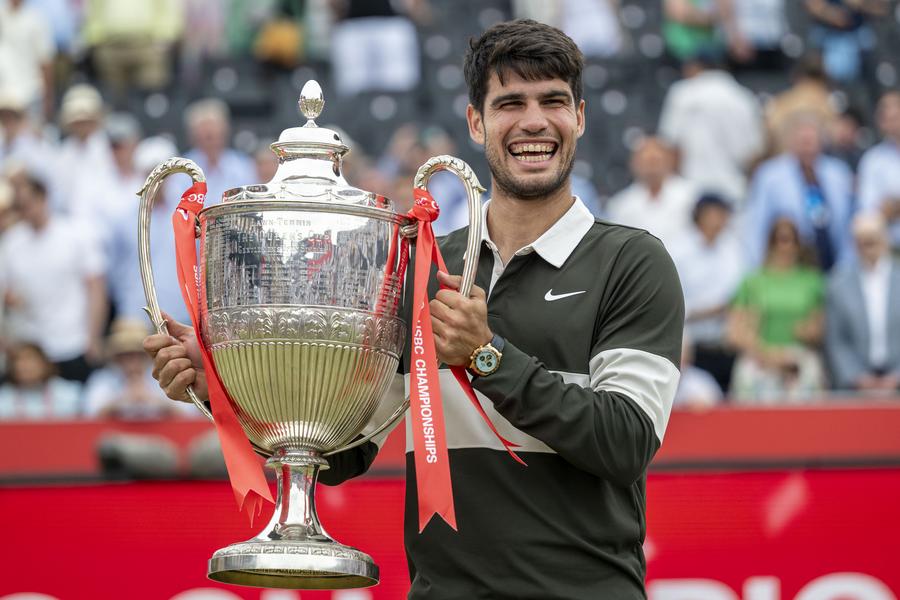 LONDON, June 22 (Xinhua) -- Top seed Carlos Alcaraz defeated Czech hopeful Jiri Lehecka 7-5, 6-7(5), 6-2 to claim the title at the Queen's Club Championships on Sunday.