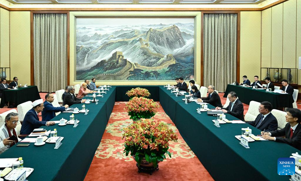 Li Hongzhong, vice chairman of the National People's Congress Standing Committee, also a member of the Political Bureau of the Communist Party of China Central Committee, meets with a delegation of the Bangladesh Nationalist Party (BNP), led by its Secretary General Mirza Fakhrul Islam Alamgir, in Beijing, capital of China, June 23, 2025. (Xinhua/Shen Hong)