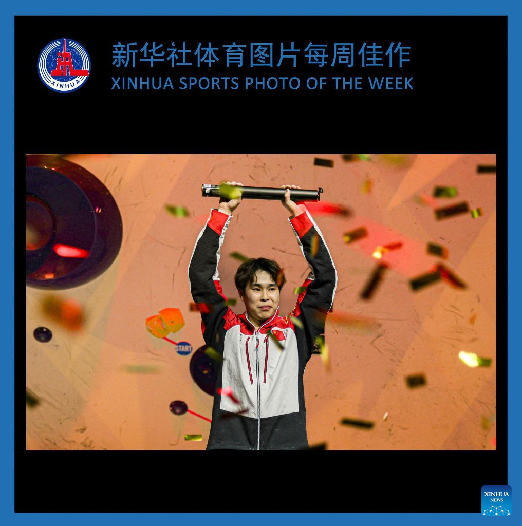 Pan Yufei of China celebrates after winning the men's boulder final at the International Federation of Sport Climbing (IFSC) World Cup in Bern, Switzerland, June 15, 2025. Chinese Olympian climber Pan Yufei became the first Chinese to win the men's Boulder event of the International Federation of Sport Climbing World Cup. (Xinhua/Liu Sheng)