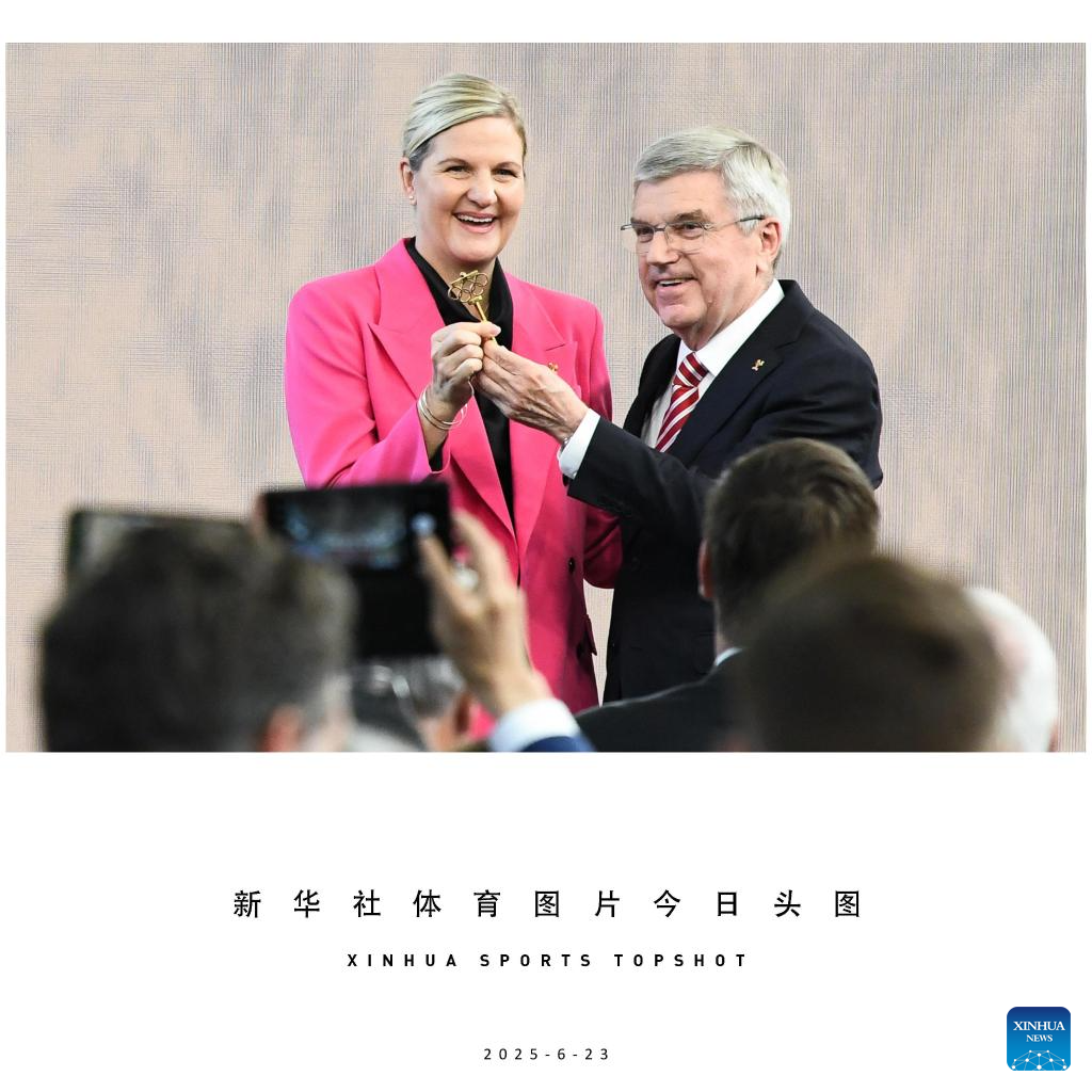 IOC President Kirsty Coventry (L) receives the key from outgoing IOC President Thomas Bach during a president handover ceremony at Olympic House in Lausanne, Switzerland, June 23, 2025. (Xinhua/Lian Yi)