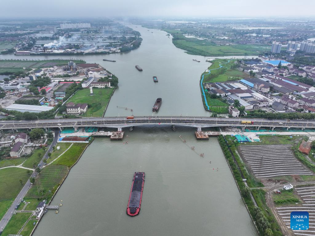 The left lanes of the newly-built Pingwang Bridge, a project of the east part of the Chang-Hu-Shen (Changxin-Huzhou-Shanghai) navigation channel (Jiangsu section) improvement project, was officially opened to traffic on Monday. (Xinhua/Ji Chunpeng)