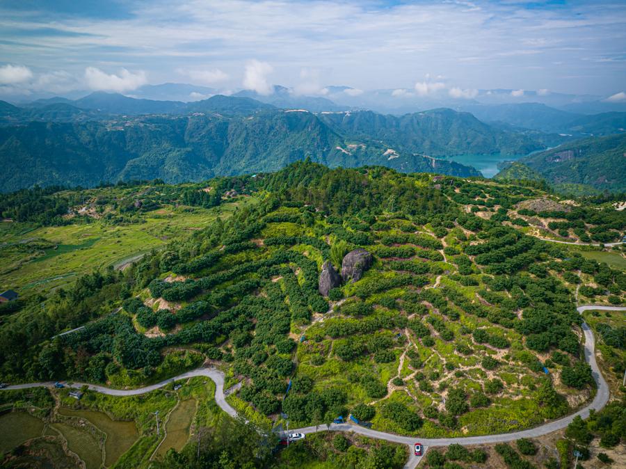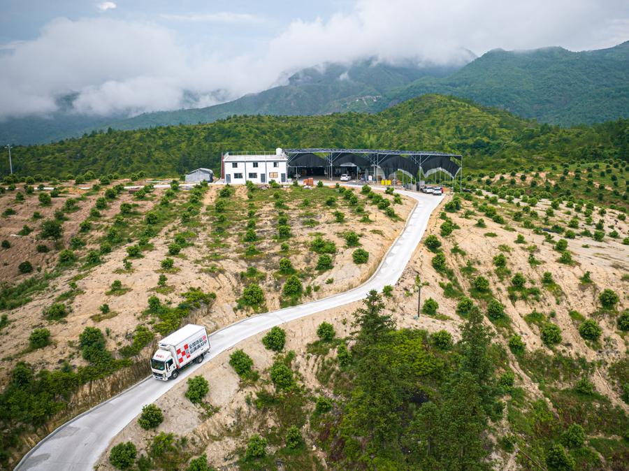 An aerial drone photo shows a cold-chain lorry loaded with Dongkui waxberries driving out of an orchard in Wencheng County, east China's Zhejiang Province, June 23, 2025. (Xinhua/Jiang Han)