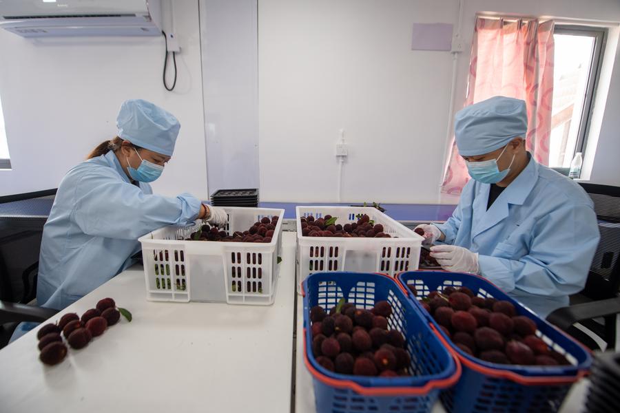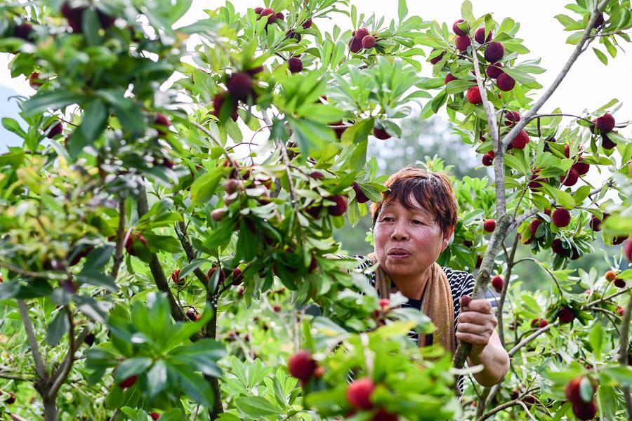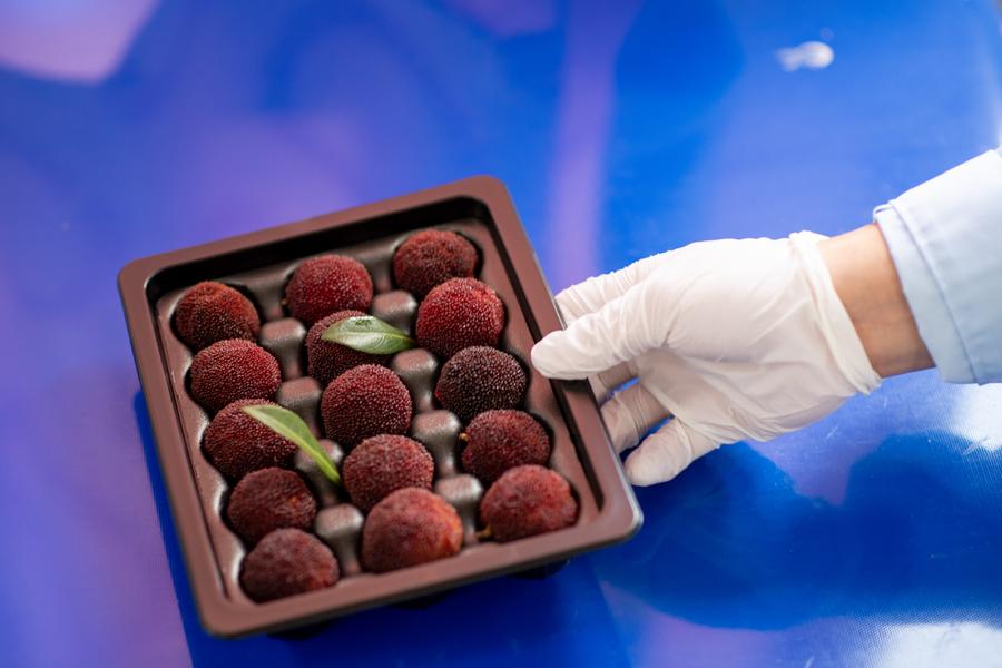 WENZHOU, June 23 (Xinhua) -- The fresh batch of premium Dongkui waxberries on Monday began an air journey from the orchards in Wencheng County, via Shanghai, to the German city of Frankfurt.