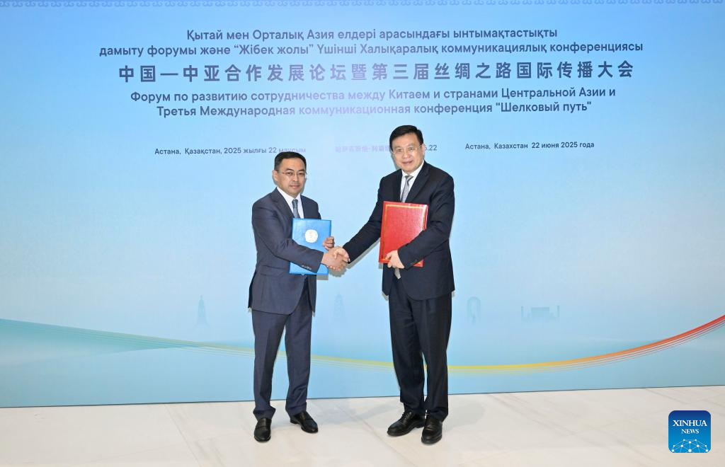 President of Xinhua News Agency Fu Hua exchanges a cooperation agreement with Arman Kyrykbayev, assistant to the president of Kazakhstan, in Astana, Kazakhstan, June 22, 2025. (Xinhua/Yin Bogu)