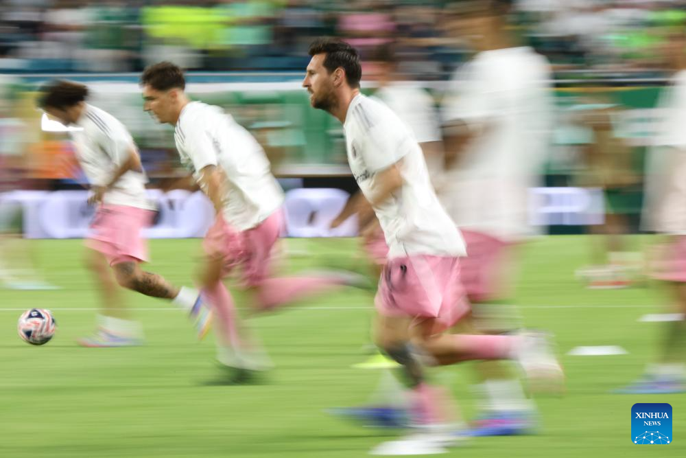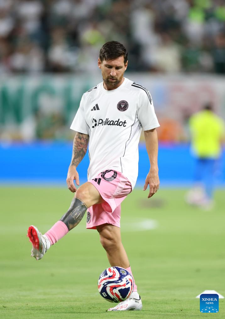 Inter Miami CF's Lionel Messi warms up before the group A match between Inter Miami CF of the United States and Palmeiras of Brazil at the FIFA Club World Cup 2025 at the Hard Rock Stadium, Miami, the United States, June 23, 2025. (Xinhua/Li Ming)
