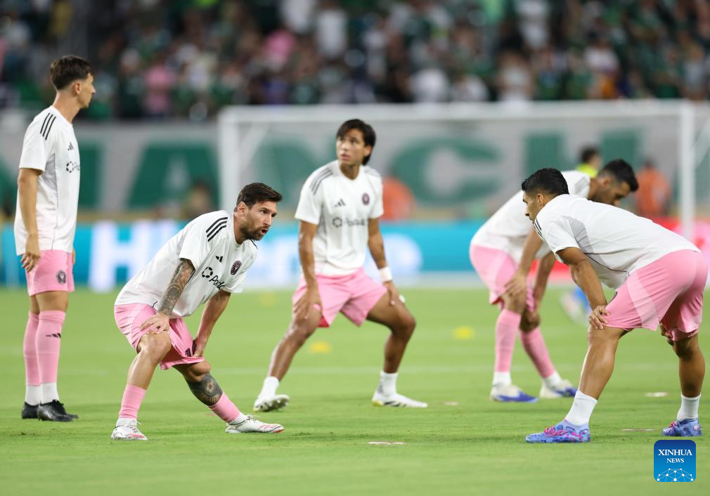 Inter Miami CF's Lionel Messi (2nd L) warms up before the group A match between Inter Miami CF of the United States and Palmeiras of Brazil at the FIFA Club World Cup 2025 at the Hard Rock Stadium, Miami, the United States, June 23, 2025. (Xinhua/Li Ming)