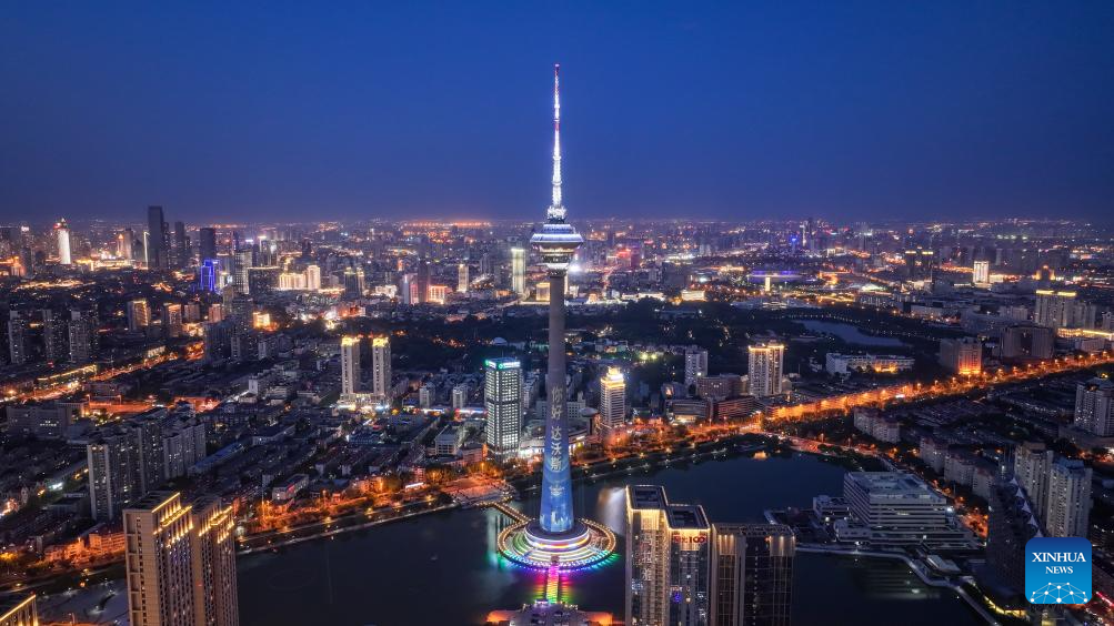 The 2025 Summer Davos forum will be held here from June 24 to 26. Many landmark buildings in the city are illuminated against the curtain of night, presenting a dazzling array of colors to welcome guests from home and abroad. (Xinhua/Sun Fanyue)