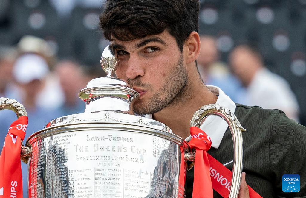 Carlos Alcaraz kisses the trophy during the awarding ceremony for the men's singles final between Carlos Alcaraz of Spain and Jiri Lehecka of the Czech Republic at the Queen's Club Championships in London, Britain, on June 22, 2025. (Photo by Stephen Chung/Xinhua)