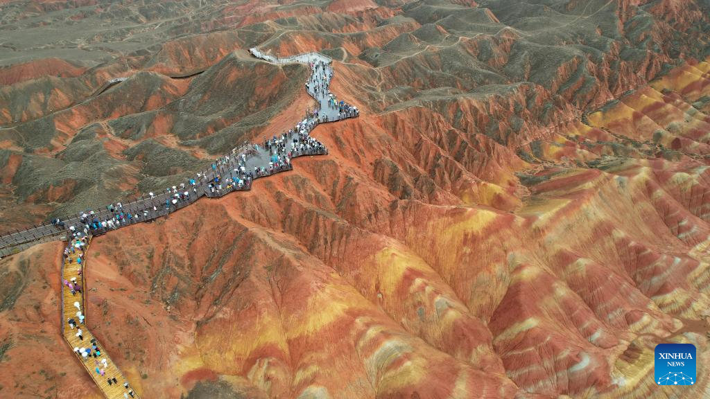 An aerial drone photo taken on June 22, 2025 shows tourists enjoying the scenery of Danxia landform in the rain at the Danxia National Geological Park in Zhangye, northwest China's Gansu Province. (Xinhua/Chen Bin)