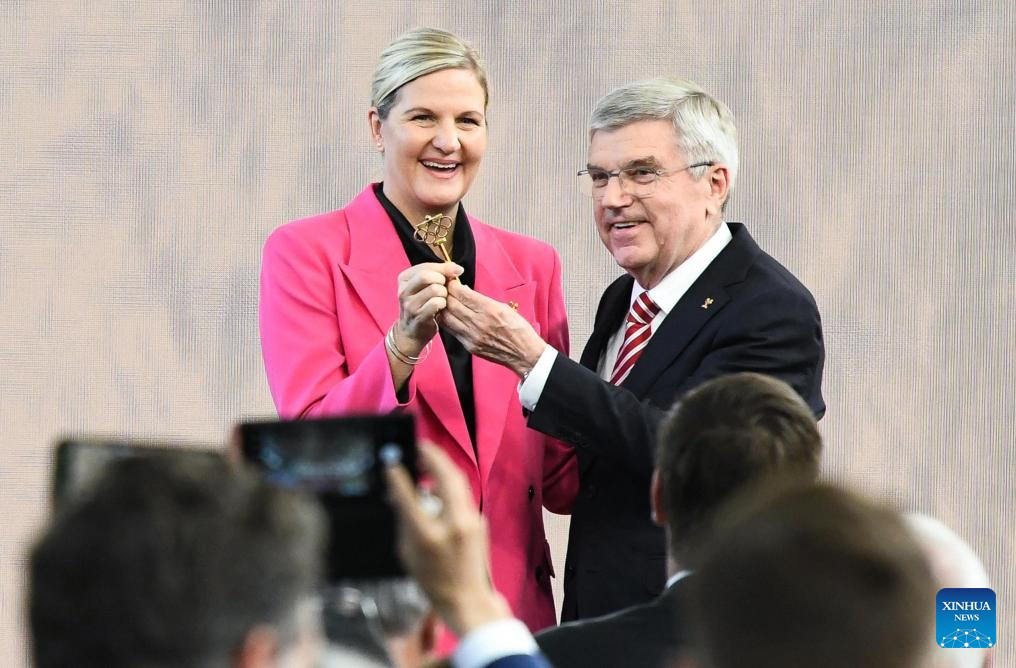 International Olympic Committee (IOC) President Kirsty Coventry (L) receives the key from outgoing IOC President Thomas Bach during a president handover ceremony at Olympic House in Lausanne, Switzerland, June 23, 2025. Zimbabwe's Kirsty Coventry took over the presidency of the IOC from Thomas Bach on Monday at the IOC headquarters in Lausanne, Switzerland. (Xinhua/Lian Yi)