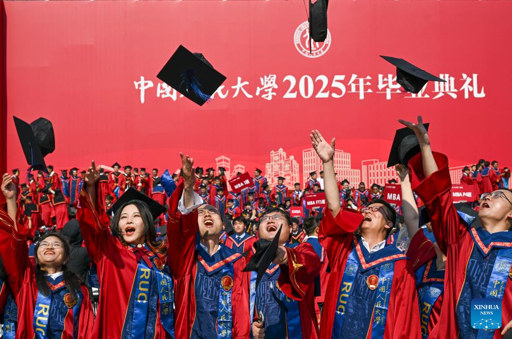 Graduates throw their hats to celebrate after the graduation ceremony at Renmin University of China in Beijing, capital of China, June 23, 2025. Renmin University of China held a series of activities for the graduation day in 2025 on Monday for a total of 8,390 graduates who have completed their studies and will embark on a brand-new life journey. (Xinhua/Chen Shuo)