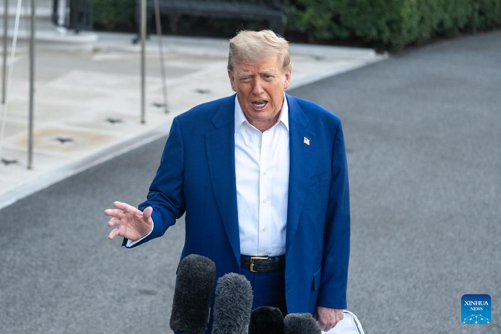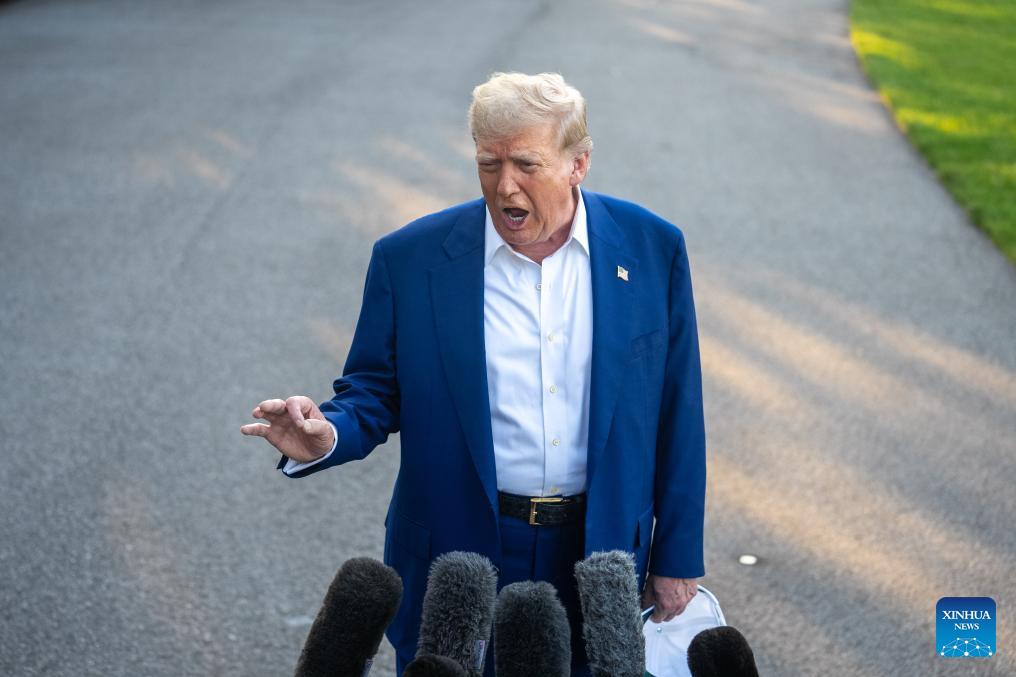 U.S. President Donald Trump takes questions from the press on the South Lawn of the White House in Washington, D.C., the United States, June 24, 2025. U.S. President Donald Trump, who announced Monday that Israel and Iran have reached a formal agreement to implement a complete and total ceasefire, criticized both sides for breaching the truce and urged Israel to show restraint. "They both violated the ceasefire," Trump said as he departed the White House (Xinhua/Hu Yousong)