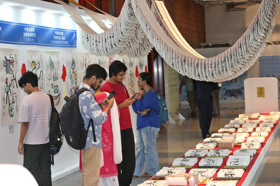 A piece of artwork is pictured at an exhibition during the China Intangible Cultural Heritage Week held at the BRAC University in Dhaka, Bangladesh on June 22, 2025. (Photo by Habibur Rahman/Xinhua)