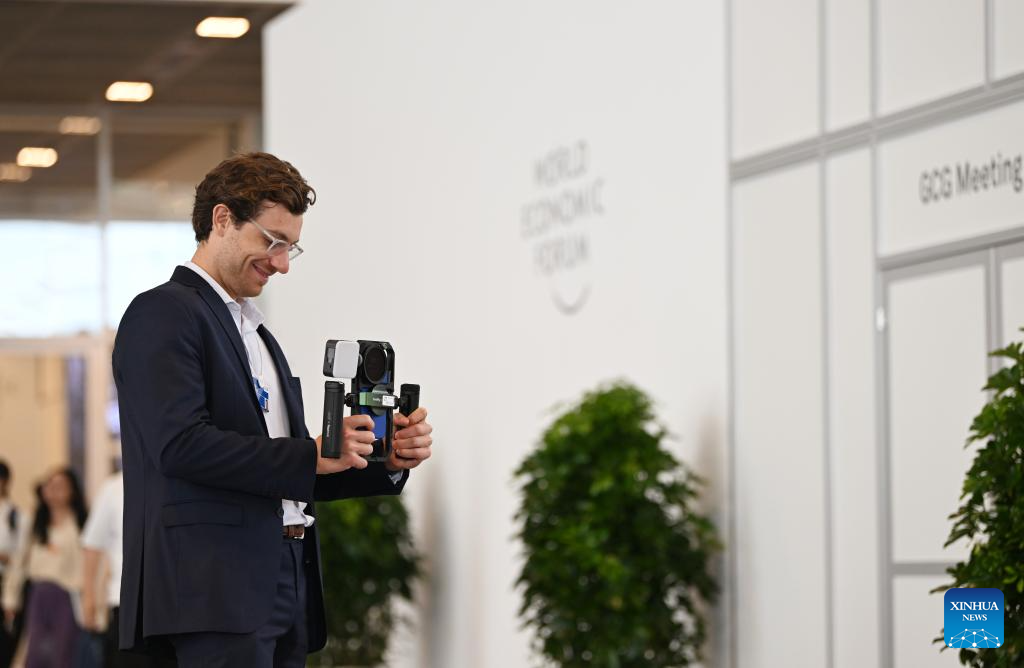 An attendee works at the Media Village inside the National Convention and Exhibition Center (Tianjin) in north China's Tianjin Municipality, June 24, 2025. The Media Village of the 2025 Summer Davos forum was open to the public here on Tuesday. Also known as the 16th Annual Meeting of New Champions of the World Economic Forum and held from June 24 to 26, this year's Summer Davos forum is themed "Entrepreneurship in the New Era" and is expected to bring together around 1,800 participants from over 90 countries and regions. (Xinhua/Li Ran)