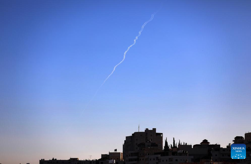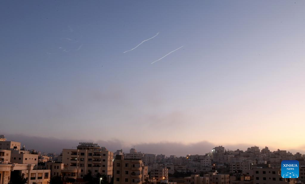 Missile traces are seen from the city of Hebron in the southern West Bank, on June 24, 2025. (Photo by Mamoun Wazwaz/Xinhua)