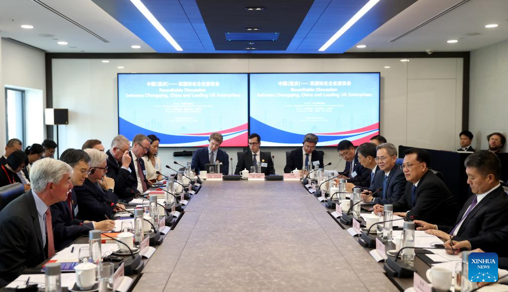 Yuan Jiajun (2nd R, front), a member of the Political Bureau of the Communist Party of China (CPC) Central Committee and the secretary of the CPC Chongqing Municipal Committee, attends a roundtable meeting between leading Chinese (Chongqing) and British enterprises, in London, Britain, June 23, 2025. (Xinhua/Li Ying)