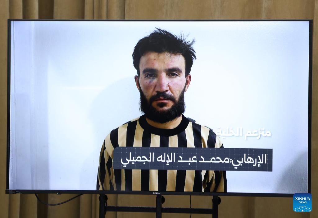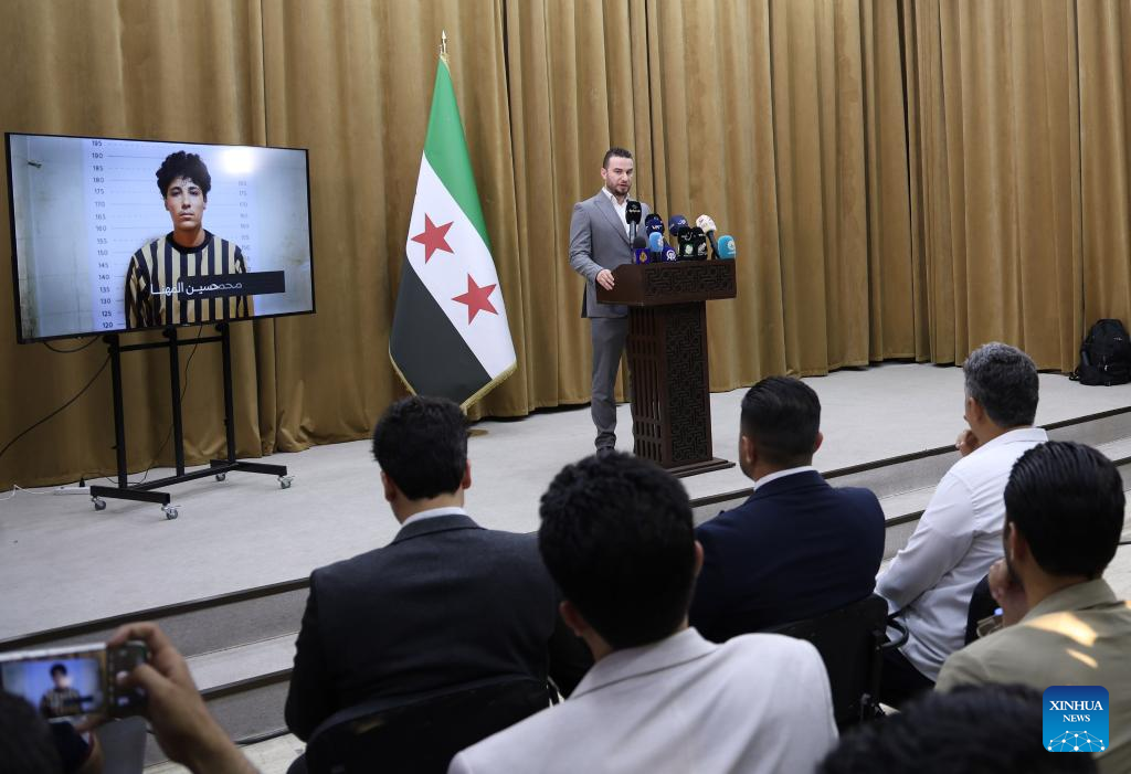A screen shows the alleged ringleader of the Islamic State (IS) cell, identified as Mohammad Abdel-Ilah al-Jumaili, at a press conference in Damascus, Syria, on June 24, 2025. The Islamic State (IS) group and remnants of other extremist factions remain the biggest security challenge to Syria, spokesman of Syrian interior authorities Noureddin al-Baba said Tuesday, following the arrest of suspects linked to a deadly suicide bombing at Mar Elias Church in Damascus. (Photo by Ammar Safarjalani/Xinhua)